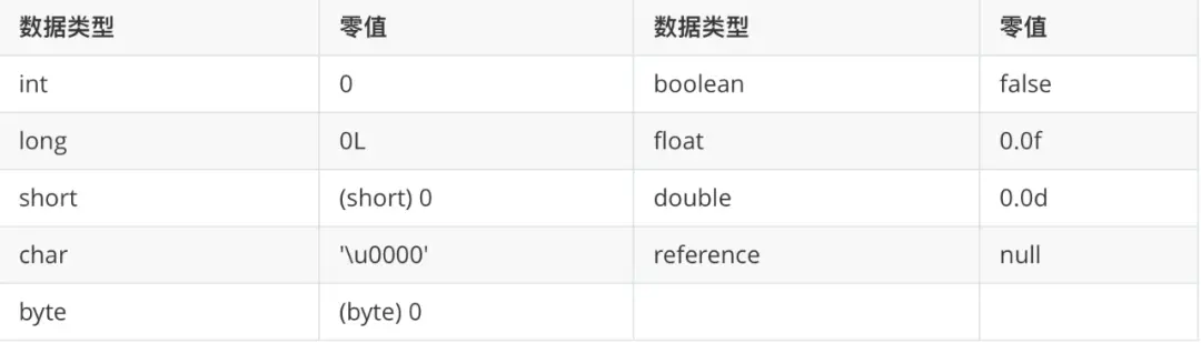 初始值“通常”情况指的是零值,基本数据类型的零值如下: