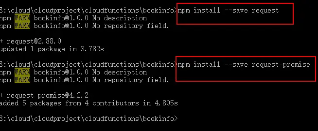 4:在cmd 打开云函数目录中,安装依赖。 输入命令: