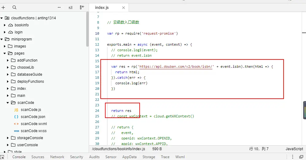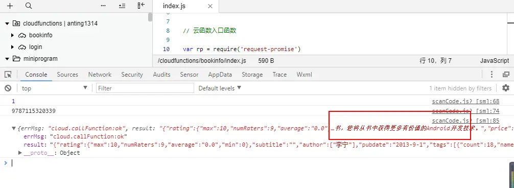 2:使用ISBN码调用云函数,在请求云函数的时候,云函数会请求豆瓣的API,获取豆瓣图书信息。