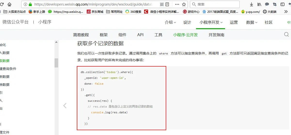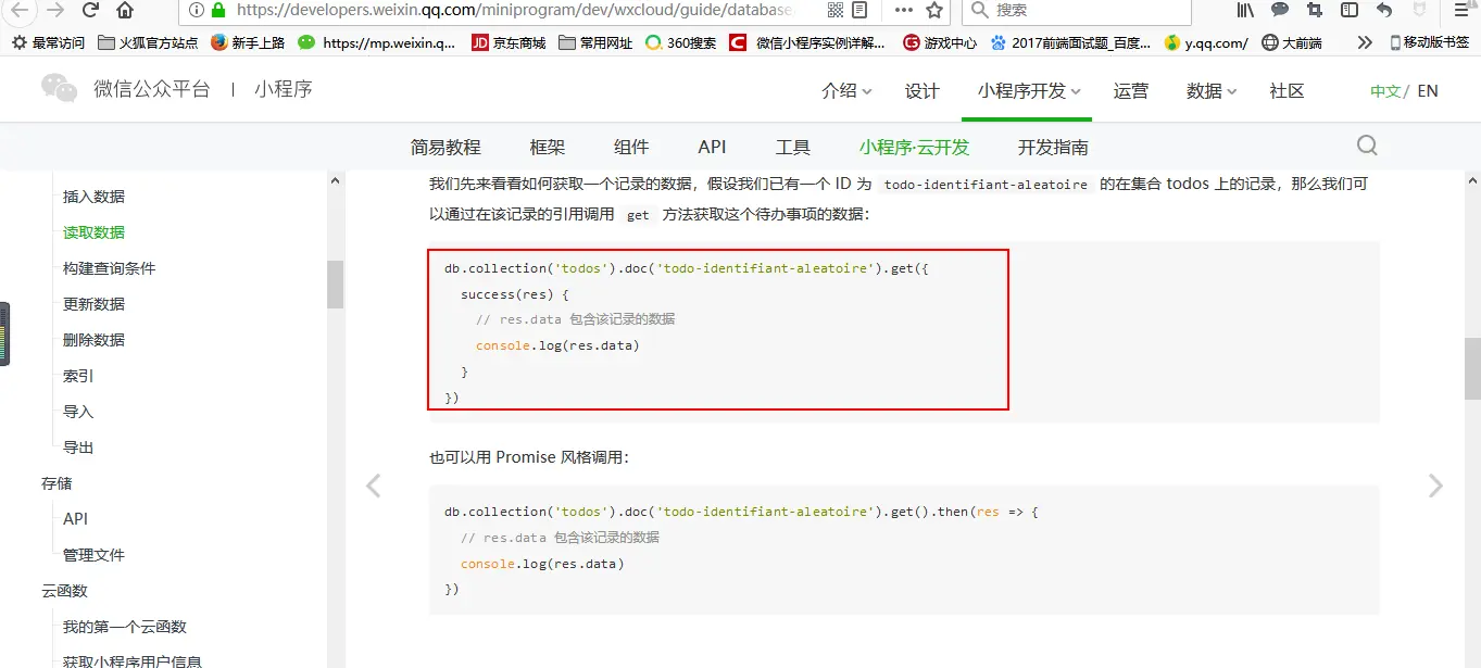 2:打开云函数文档里面的读取数据apihttps://developers.weixin.qq.com/miniprogram/dev/wxcloud/guide/database/read.html