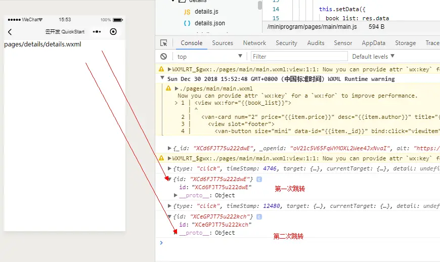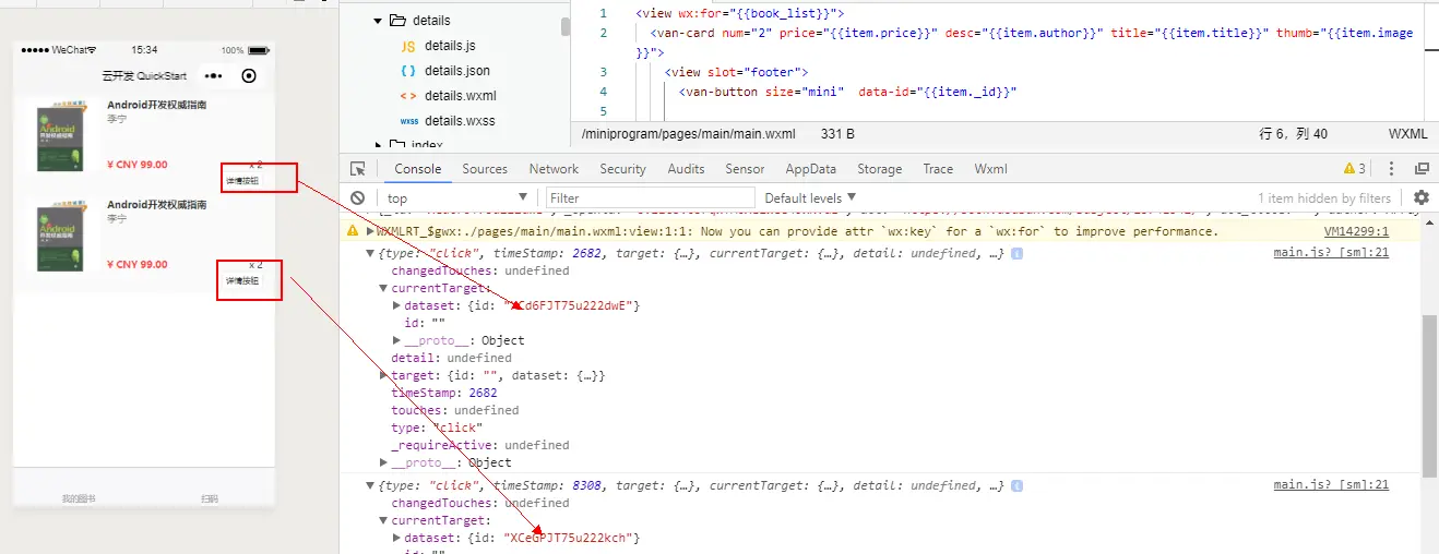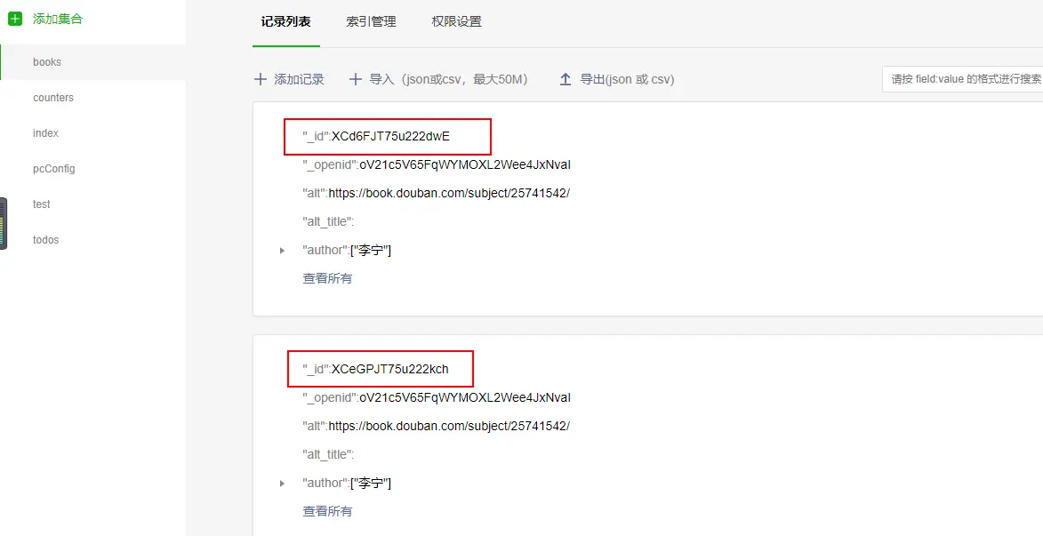 4:如何知道要跳转列表图书中的哪个详情页?要在云开发里面写一个特定的id,打开云开发控制台,数据库,需要用到这个下划线是_id的字段