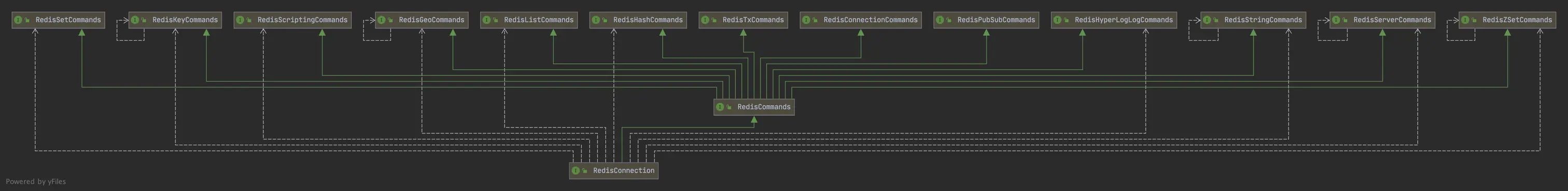 可以看到,RedisConnection 集成 RedisCommands 集成 一系列的 数据结构相关的 commands 接口