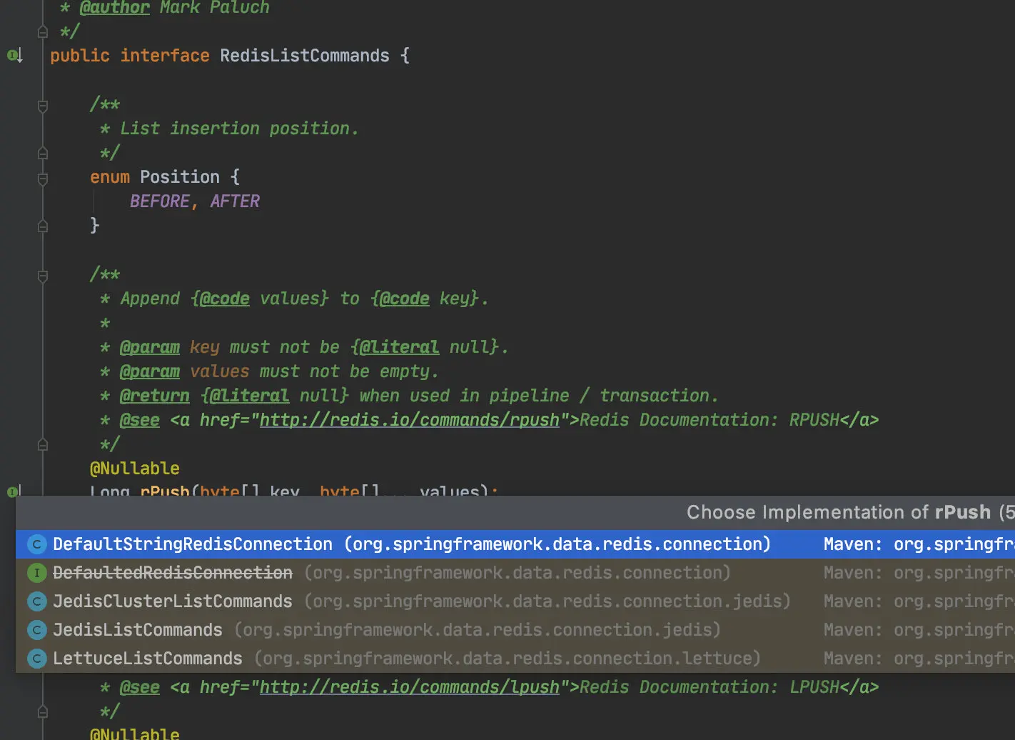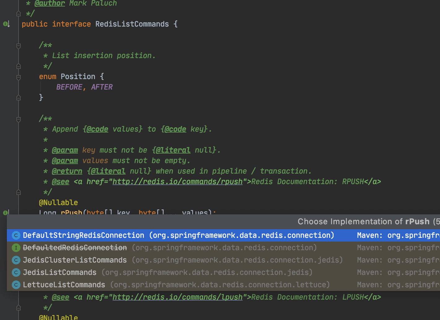 DefaultListOperations ListOperations 的实现类中,主要就是进行一系列的原生命令的封装和调用,具体看个栗子
