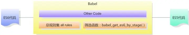 那如果我们有一个工厂函数,接受数字0-4作为参数,然后返回所有经历了stage-x的规则集(是ES6规则的子集)作为规则集合,那么就可以在最终生成生产环境的代码时减小代码体积,假如在项目中通过babel_get_es6_by_stage(2)这样一个函数返回了规则集,那么正式代码中就不需要stage-0和stage-1的实现代码了。基于以上的考虑,我们对Babel工具进行第一次功能剥离:
