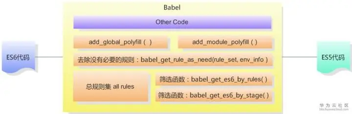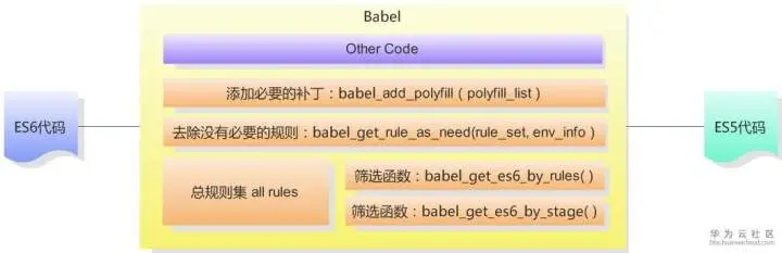 我们既可以主动提供一个polyfill列表指明需要添加的垫片插件数组,也可以采用被动的方式,在转码过程中遇到的这种API类型的新特性放进一个数组,通过babel_add_polyfill ( polyfill_list )为根据安装相应的垫片,需要注意的是,polyfill相当于为浏览器进行功能扩展,需要优先于项目业务逻辑代码运行,那么babel的逻辑框架就变成了: