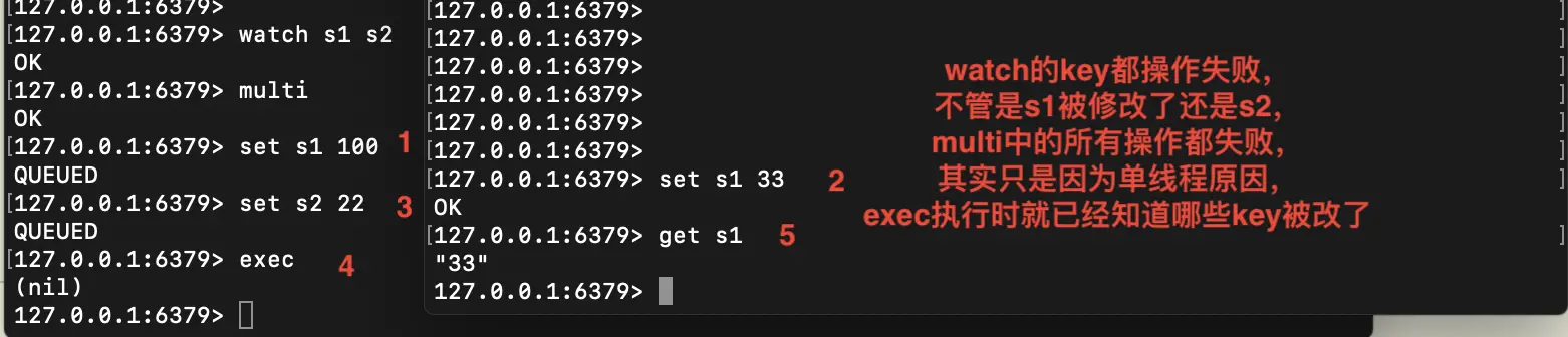这很好理解,即便事务中各命令的顺序不一样,因为单线程执行命令的原因,exec执行时就已经知道被监听的哪些key被修改过了,它只是不执行事务了。