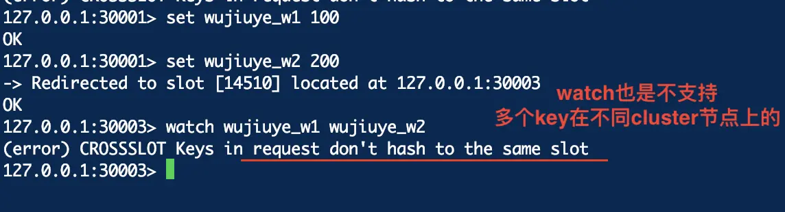 Watch是真的严格,不同slot都不行。有没有想过为什么监听多个落在不同节点上的key,会不被允许?在单节点下,Redis单线程执行,能够保证原子性,但在不同节点下,就是多进程多线程的问题,Watch自然就不能用。