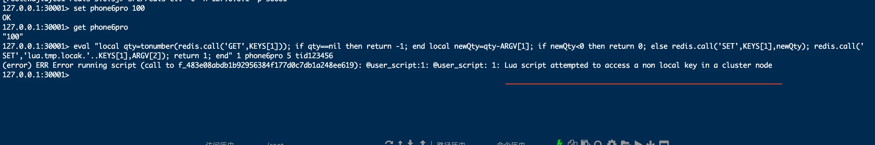 事实上,如果要操作的key不在同一节点上,命令执行也会保错。下图是Lua脚本试图访问群集中的非本地节点抛出的错误。