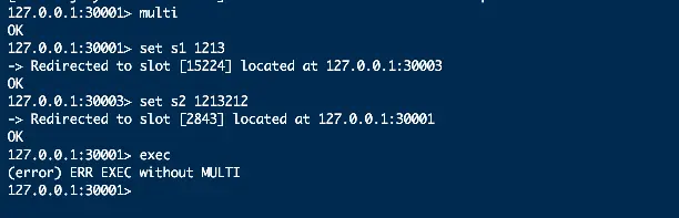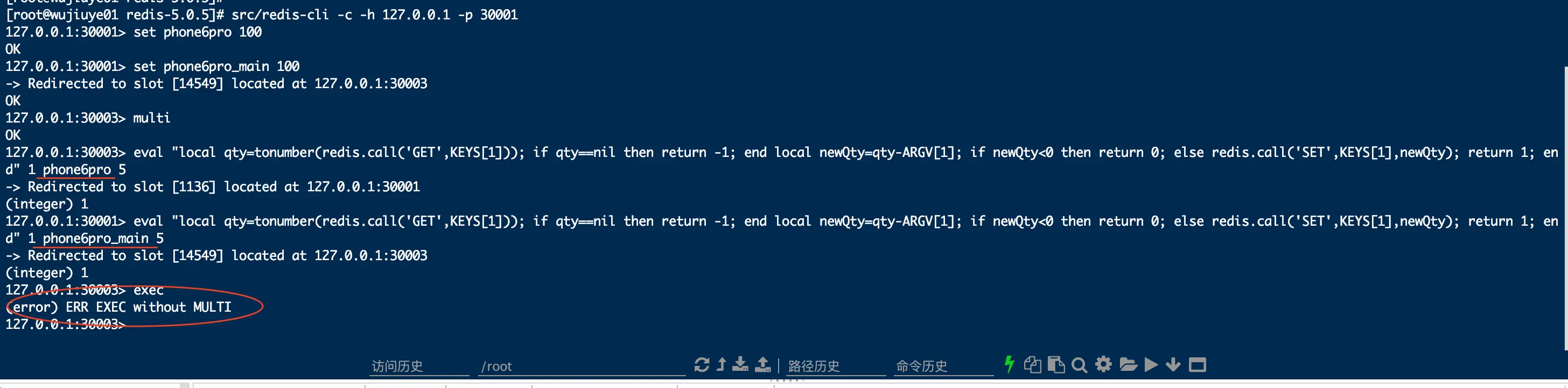 即便是在一个事务中执行多个lua脚本,只要有一个lua脚本操作的key落在不同的节点,结果都会执行失败。