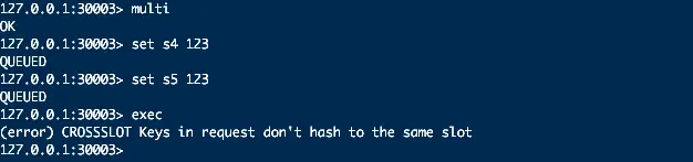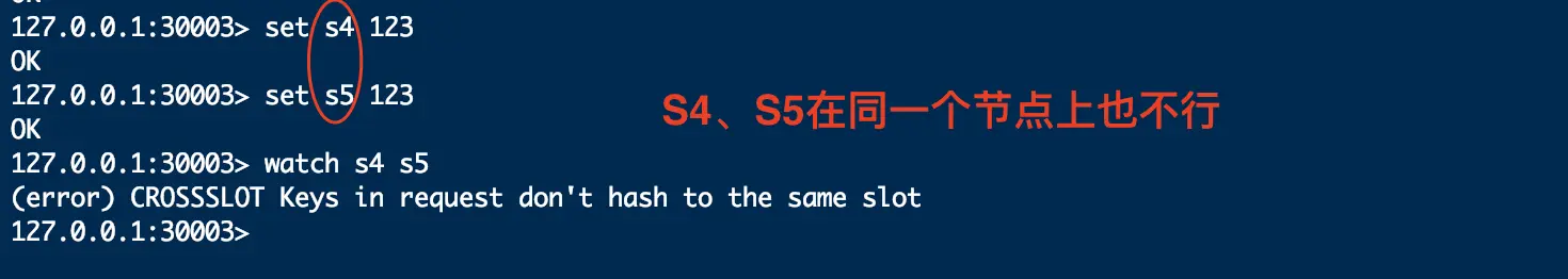 可以看到,在Watch的时候就出错了,请求不允许key在不同的slot。即便slot不同但都在同一个节点也是不行的,必须是同一个slot。下图中,s4和s5这两个key是在同一个节点上的。