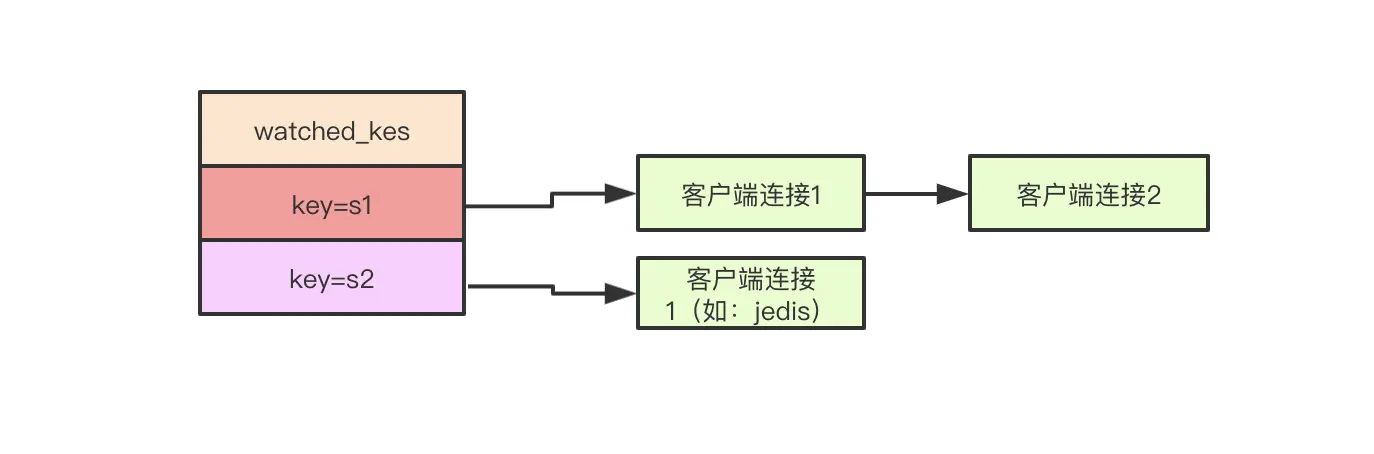 每个Redis数据库中都保存着一个watched_keys的字典,这个字典的键是某个被Watch命令监视的键,如上面例子中的s1、 s2,而字典的值则是一个链表,链表中记录所有监视该键的客户端,即一个连接。