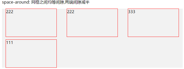 space-around: 行两边都隔开(margin-top,margin-top),行的上下间隔是一样的,两行之间的间隔是*2