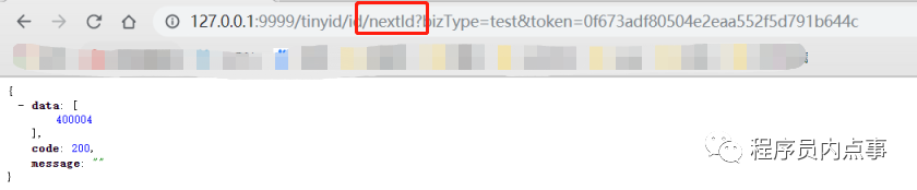 nextId:'http://localhost:9999/tinyid/id/nextId?bizType=test&token=0f673adf80504e2eaa552f5d791b644c'response :{"data": [2],"code": 200,"message": ""} nextId Simple:'http://localhost:9999/tinyid/id/nextIdSimple?bizType=test&token=0f673adf80504e2eaa552f5d791b644c'response: 3