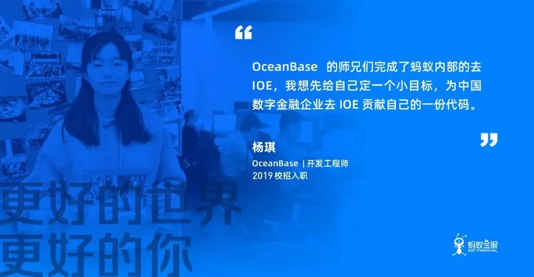 杨琪是蚂蚁金服OceanBase存储组的一名开发工程师。2019年她通过校招内推加入蚂蚁,此时此刻,她已与蚂蚁相伴261天。