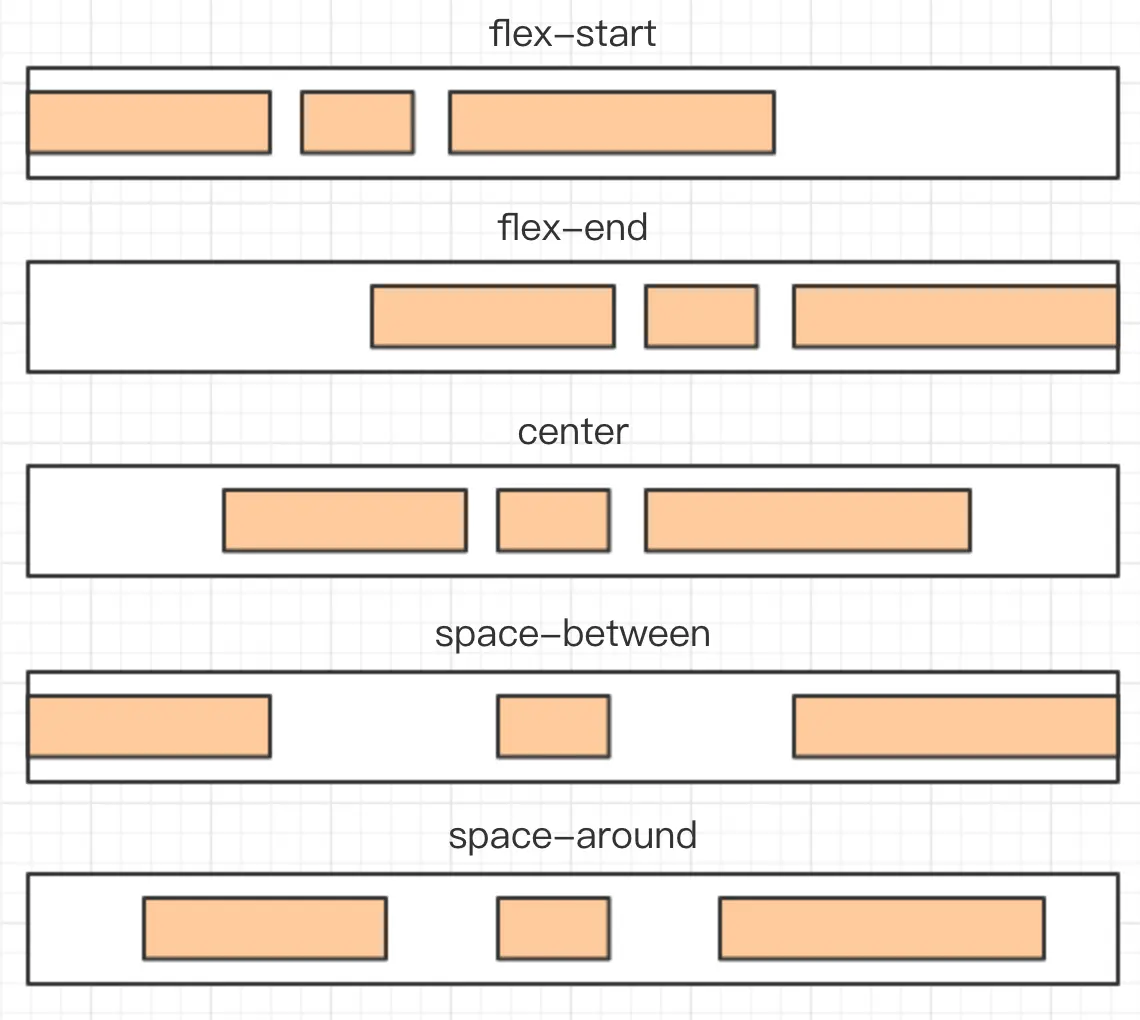 justify-content: flex-start | flex-end | center | space-between | space-around;