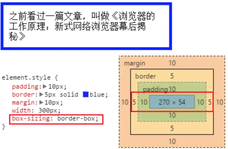 上图中,为div设置了box-sizing:border-box之后,300px 的宽度是内容 + padding + 边框的宽度(不包括margin),这样就比较符合我们的实际要求了。建议大家在为系统写 CSS 时候,第一个样式是: