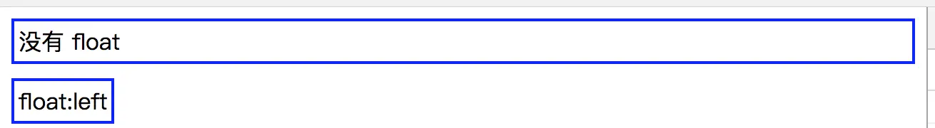 如上图,普通的 div 如果没有设置宽度,它会撑满整个屏幕,在之前的盒子模型那一节也讲到过。而如果给 div 增加float:left之后,它突然变得紧凑了,宽度发生了变化,把内容中的三个字包裹了——这就是包裹性。为 div 设置了 float 之后,其宽度会自动调整为包裹住内容宽度,而不是撑满整个父容器。