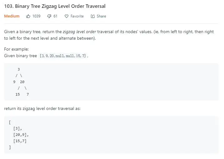 大家可以先做下 102 题 吧,直接在 102 题的基础上进行修改即可。从左到右和从右到左交替,所以我们只需要判断当前的 level,层数从 0 开始的话,偶数就把元素添加到当前层的末尾,奇数的话,每次把新元素添加到头部,这样就实现了从右到左的遍历。