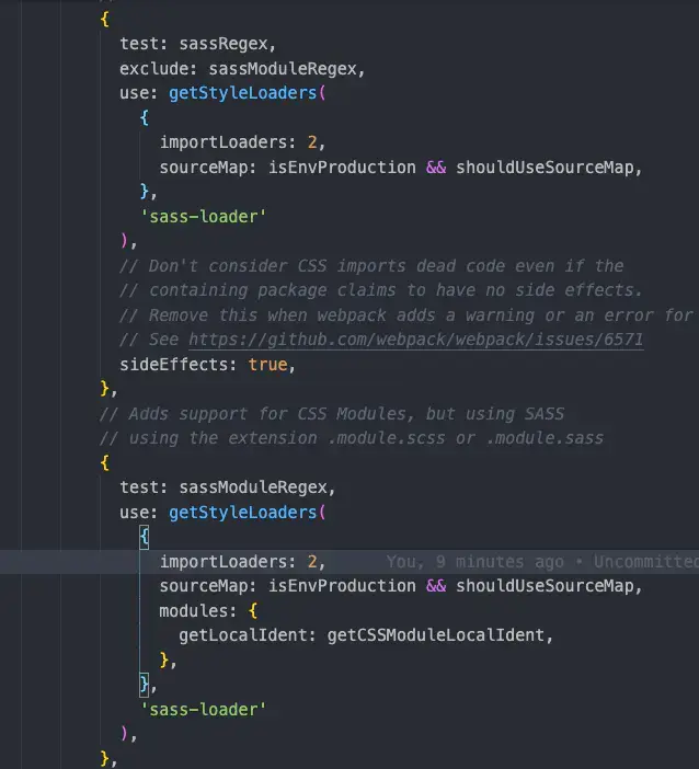 2.进入config/webpack.config.js文件找到sass的配置文件,我们把自己的配置文件添加在sass后面就好了,并且只需要改改名字,抄上即可