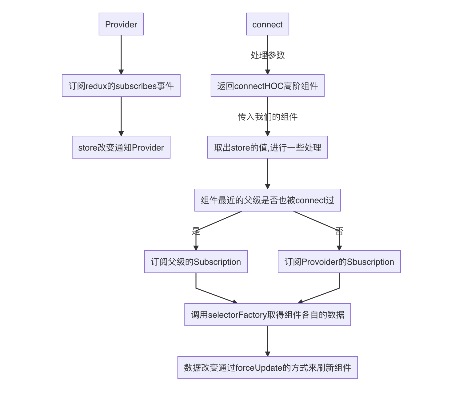 在组件挂载完成后,如果store有更新,Provider会通知下一级组件的Subscription,下一级组件又会通知自己的下一级组件
