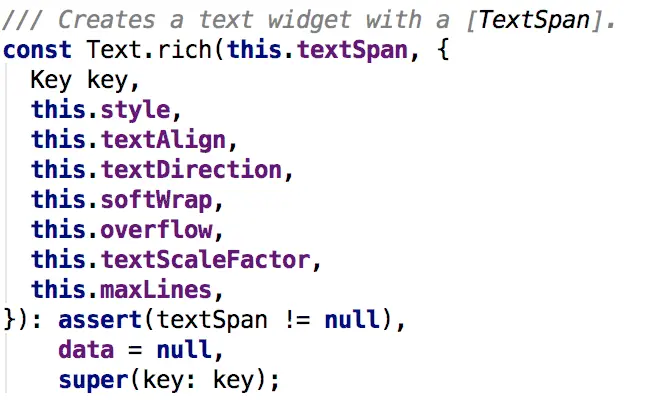 可以看到,两个构造方法的不同在于构造方法中的第一个参数,普通的是一个String对象,data; 复杂的是一个TextSpan对象,textSpan。从事Android开发的朋友一定用过SpannableString,感觉上应该会和TextSpan差不多吧。