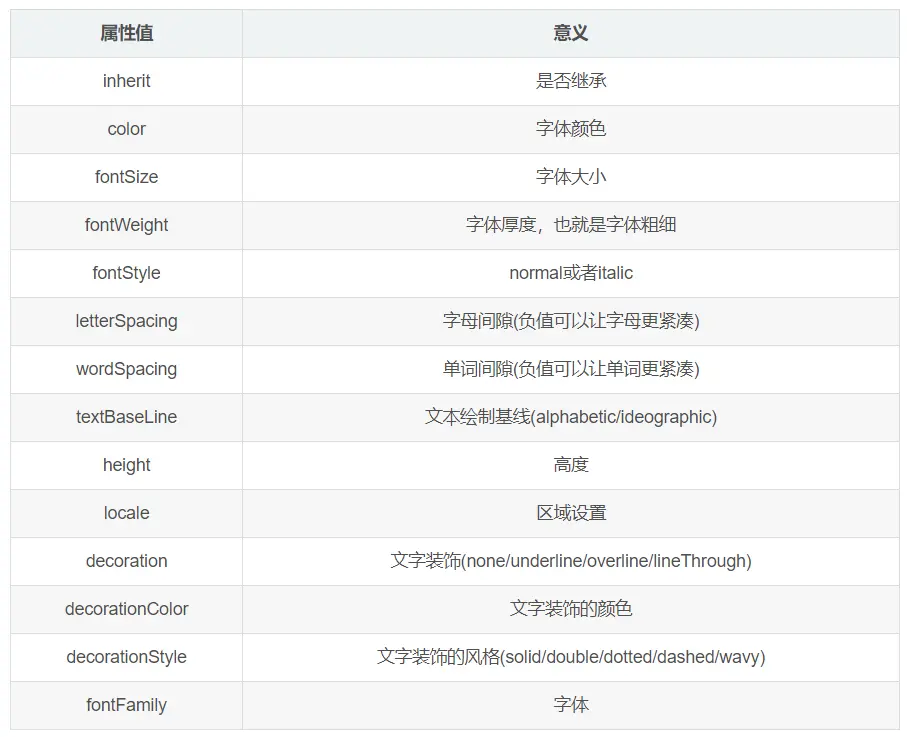 TextStyle,用来定义Text中文字的各种属性。后面的例子会陆续使用到一些,常用的属性值也是相当好理解的。具体如下: