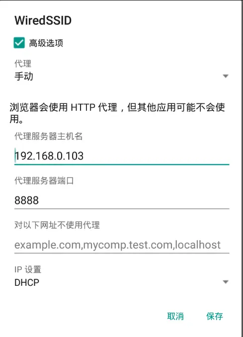 在保证手机和电脑在同一局域网的情况下,代理服务器主机名设为电脑的ip地址,端口设为8888。