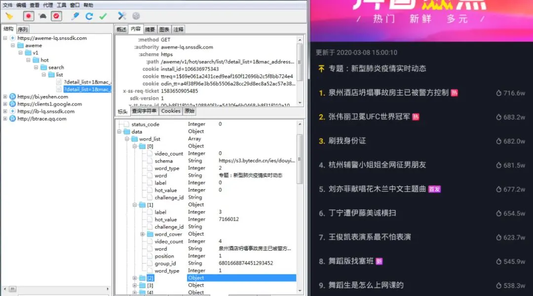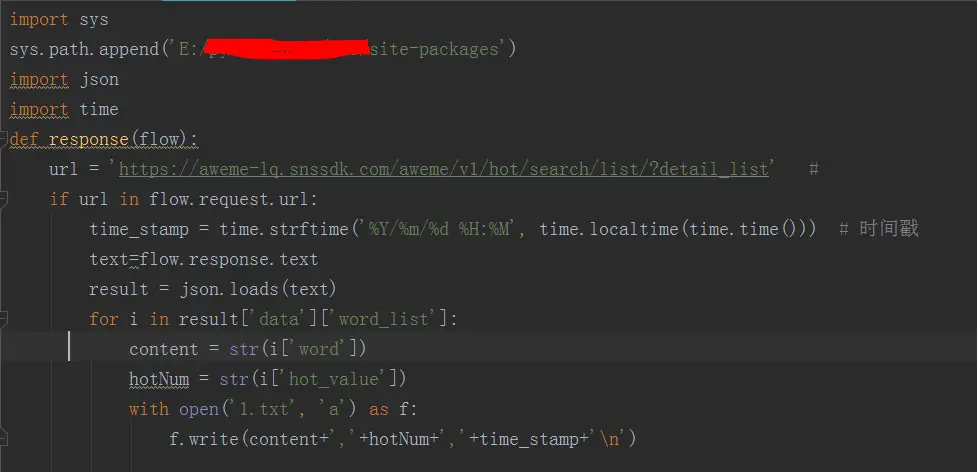3.脚本中if url in flow.request.url为数据流判断条件,如果url在该数据流的url请求数据中,则判断该数据为抖音app热点数据;