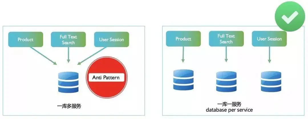 - 每个服务都各有一个数据库,同属性的服务可共享同个数据库。