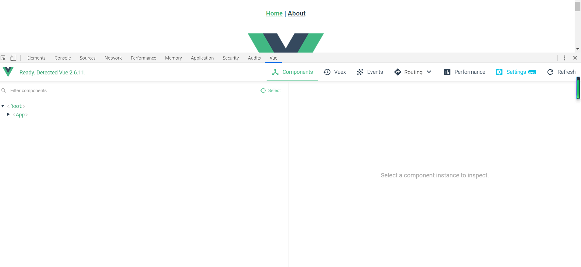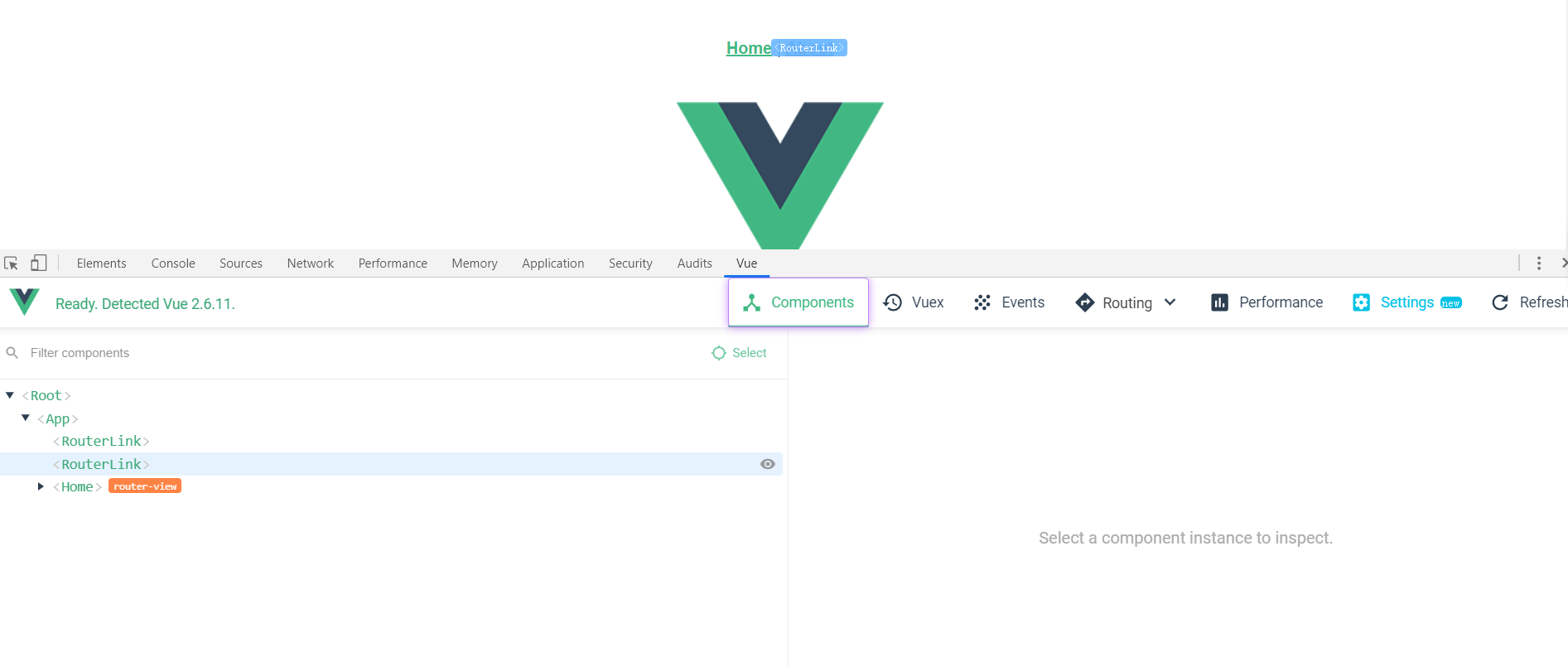 当我们添加完vue-devtools扩展程序之后,我们在调试vue应用的时候,chrome开发者工具中会看一个vue的一栏,点击之后就可以看见当前页面vue对象的一些信息。vue-devtools使用起来还是比较简单的,上手非常的容易。