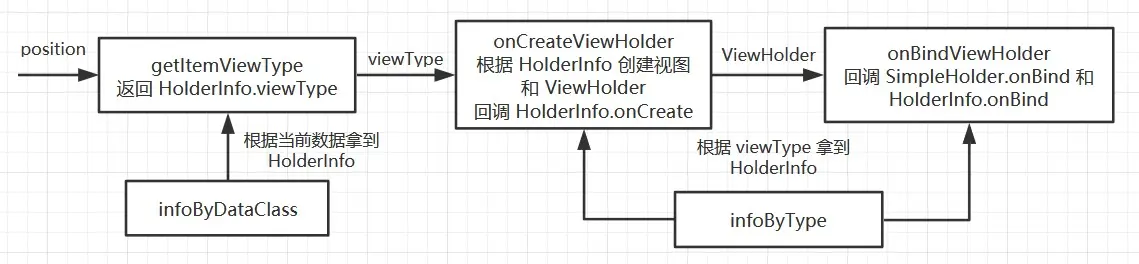 拿到 HolderInfo 的方式有两种,一种是 getItemViewType 根据当前数据拿到对应支持的 HolderInfo,另一种就是 onCreateViewHolder 和 onBindViewHolder 需要根据 viewType 拿到 HolderInfo。