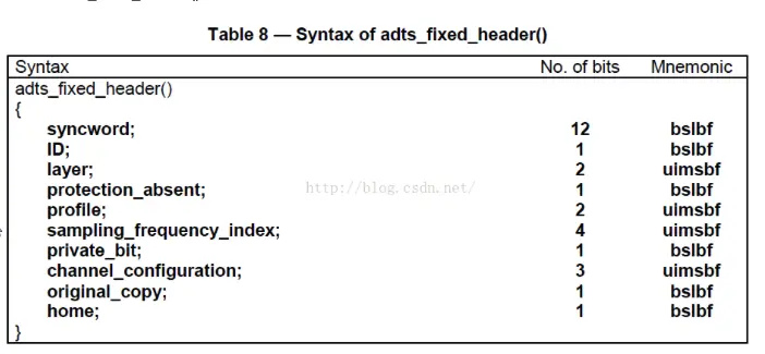- yncword :总是0xFFF, 代表一个ADTS帧的开始, 用于同步.解码器可通过0xFFF确定每个ADTS的开始位置.因为它的存在,解码可以在这个流中任何位置开始, 即可以在任意帧解码。