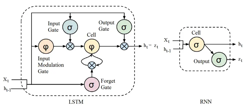 为了提高模型的性能,研究者修改了原始的神经元,创造了更复杂的结构,比如 GRU 单元[9] 和 LSTM 单元[11],分别如下图所示。LSTM 在自然语言处理的任务中应用得非常广泛,包括翻译、语音生成、从文本生成语音等。