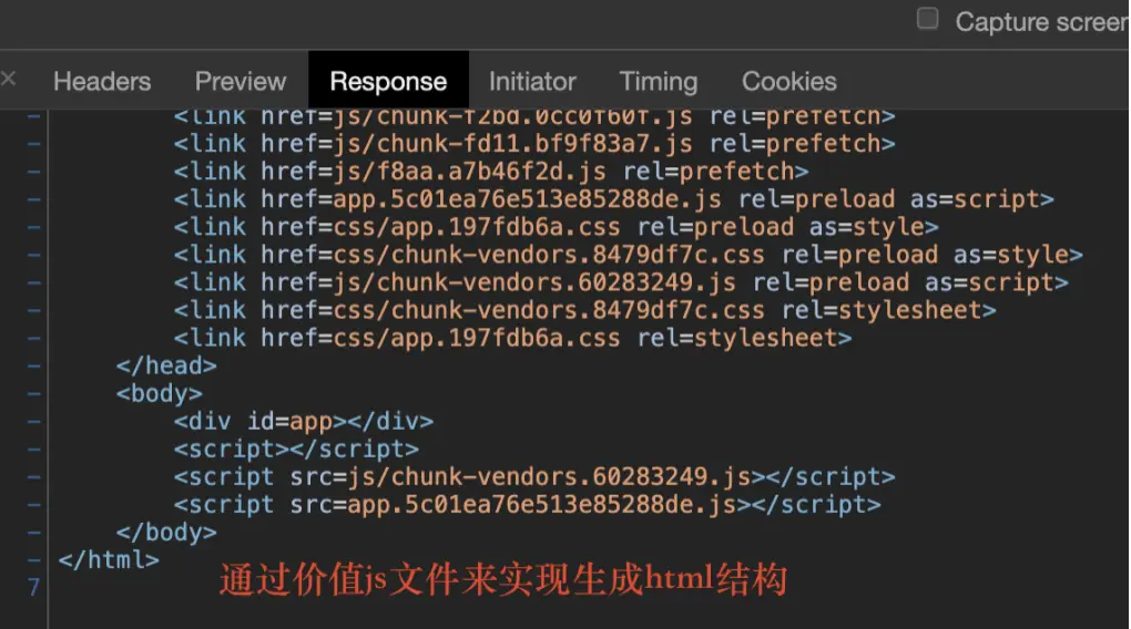 查看下面两张图,可以看到如果是服务端渲染,那么在浏览器中拿到的直接是完整的 html 结构。而单页面是一些 script 标签引入的js文件,最终将虚拟dom去挂在到 #app 容器上。