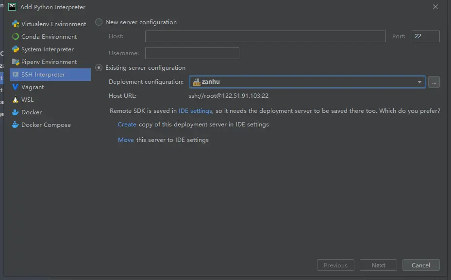 点击settings-->Project interpreter-->show All..-->点击加号-->SSH interpreter-->Existing server configuration-->点击下拉箭头,选择一个