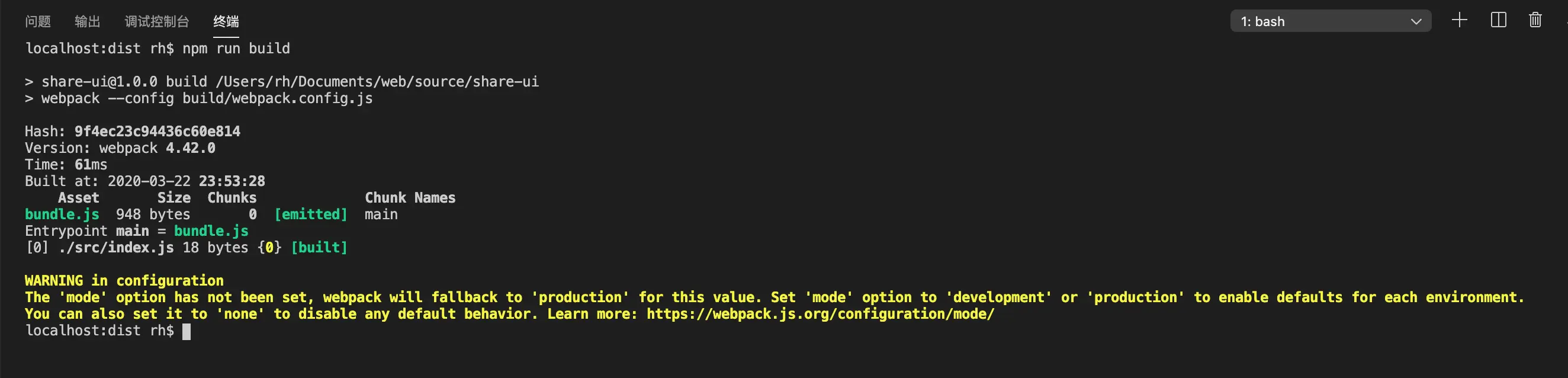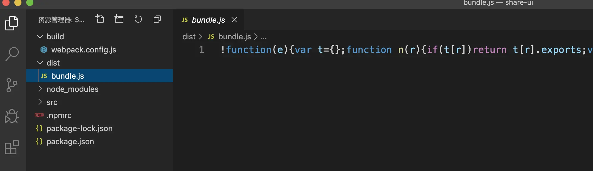 此时目录结构中会多出一个dist目录和在dist目录下面多了bundle.js
