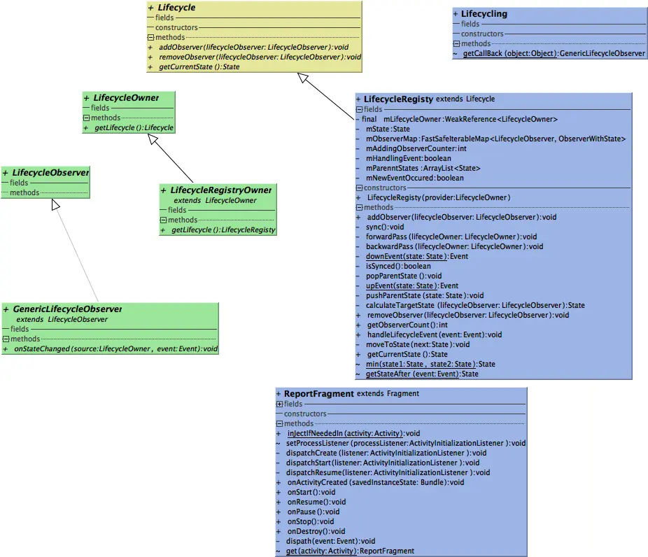 从源码中看,这部分的代码在ComponentActivity中的ReportFragment,在OnCreate的时候调用了上图类图中的injectInNeededIn(Activity activity),该方法就是往Activity中attached一个Fragment,这样Activity的生命周期发生变化的时候,就可以触发事件的分发和状态的变更。