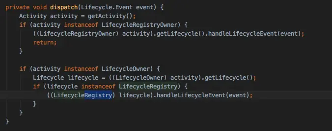 通过Activity的getLifecycle获取到LifecycleRegistry,然后调用handleLifecycleEvent(event).