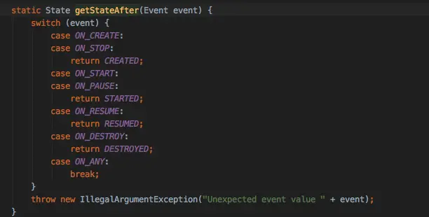 State next = getStateAfter(event),如果这次事件是OnCreate,对照上面官方的状态图,那么State就是CREATE,如果这次事件是onResume那么状态就是要变成RESUMED了。