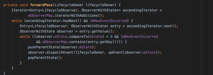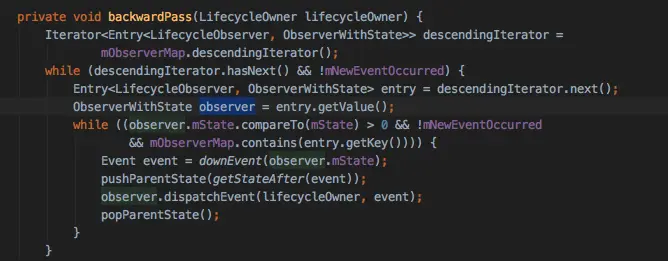 同步相关的事件和状态给已经注册的Observer,当当前的状态State比map(这个map保存了通过AddObserver添加的Observer)中的最早也就是头部元素的枚举State状态要小,那么就是遍历这个map中的所有的Observer,分发事件并同步Observer的状态到和当前状态一致。源码就是backWardPass(lifecycleOwner)