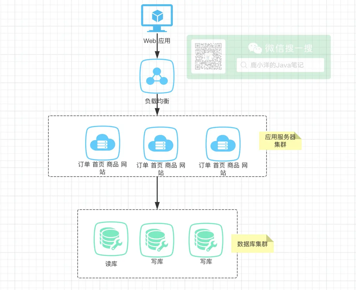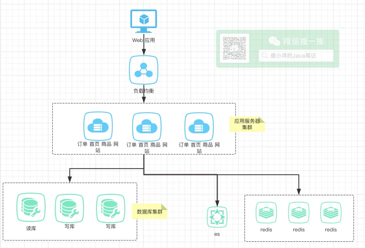这个时候公司初创,人少,事儿少,用户少,当然了老板的钱也少,本着多快好省的信念,作为公司唯一开发工程师小鹿,跌跌撞撞的开发了一款能用的商城网站,架构如下: