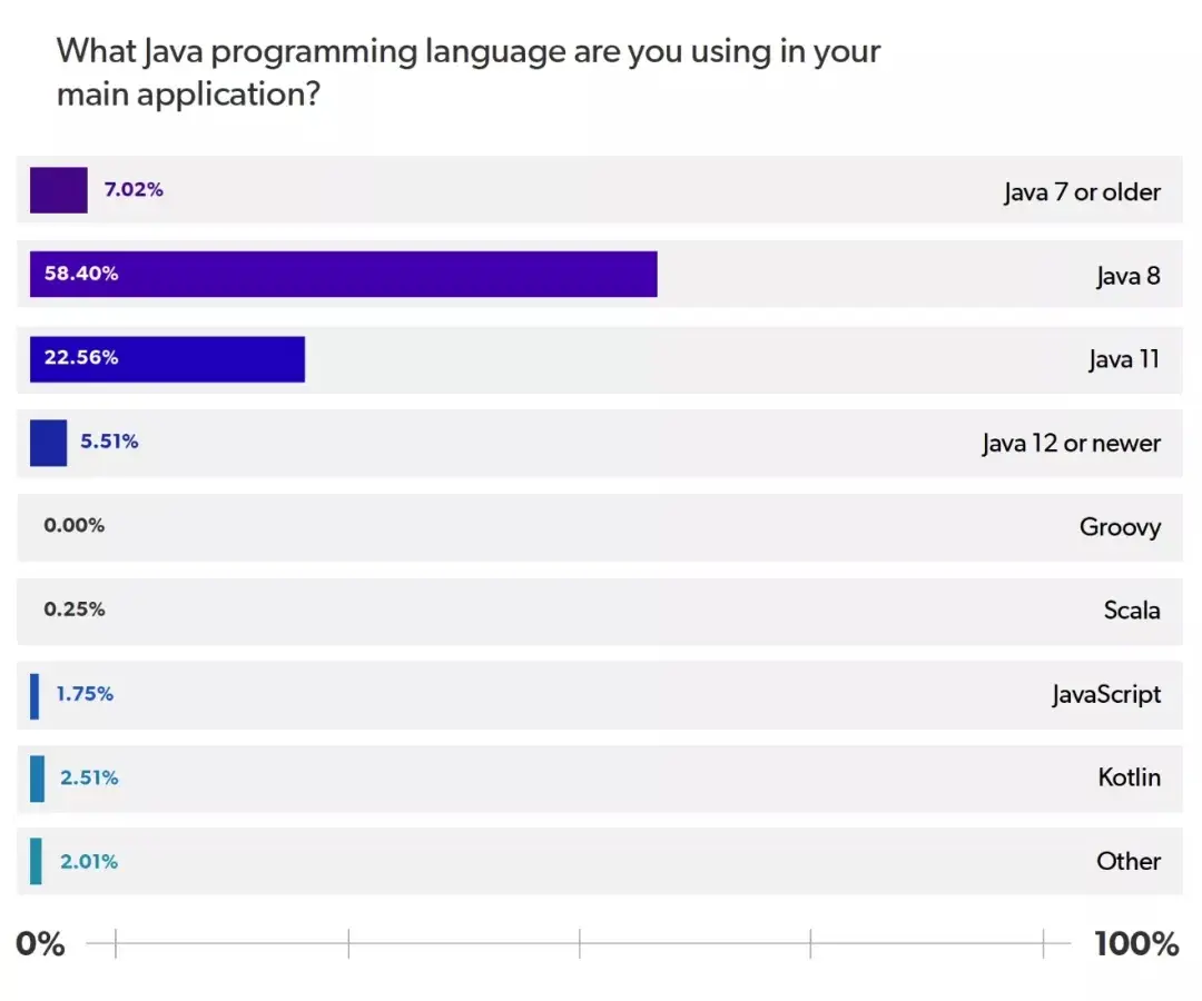 从这些统计中,可以看到使用的最多的还是Java 8,其次就是Java 11。