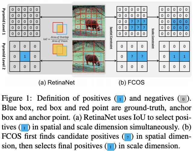 )来区分正负anchor bbox,处于中间的全部忽略。FCOS使用空间尺寸和尺寸限制来区分正负anchor point,正样本首先必须在GT box内,其次需要是GT尺寸对应的层,其余均为负样本