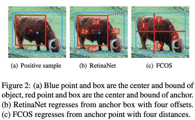 RetinaNet预测4个偏移值对anchor box进行调整输出,而FCOS则预测4个相对于anchor point值对anchor box进行调整输出