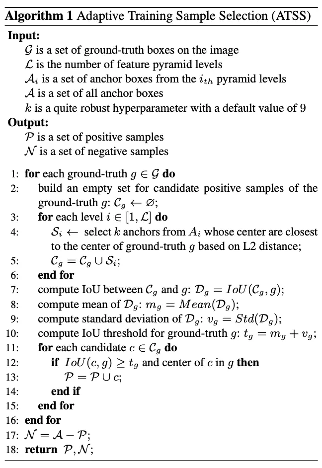论文提出ATSS方法,该方法根据目标的相关统计特征自动进行正负样本的选择,具体逻辑如算法1所示。对于每个GT box ,首先在每个特征层找到中心点最近的