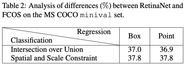 论文选取anchor-based方法RetinaNet和anchor-free方法FCOS进行对比,主要对比正负样本定义和回归开始状态的差异,将RetinaNet的anchor数改为1降低差异性,方便与FCOS比较,后续会测试anchor数带来的作用