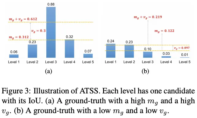 表示适合GT的FPN层数,标准差高则表示高质量的anchor box集中在一个层中,应将阈值加上标准差来过滤其他层的anchor box,低则表示多个层都适合该GT,将阈值加上标准差来选择合适的层的anchor box,均值和标准差结合作为IoU阈值能够很好地自动选择对应的特征层上合适的anchor box