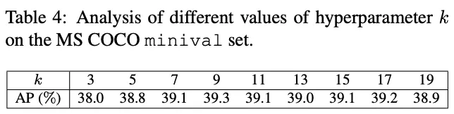 参数k在区间几乎是一样的,过大的设置会到导致过多的低质量候选anchor,而过小的设置则会导致过少的正样本,而且统计结果也不稳定。总体而言,参数