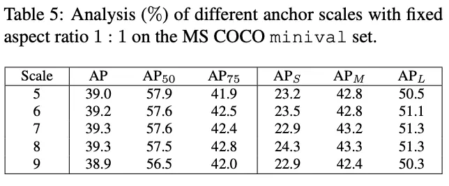 在FCOS的full版本中使用了的anchor box,论文对不同的尺寸进行了对比,如表5所示,也在