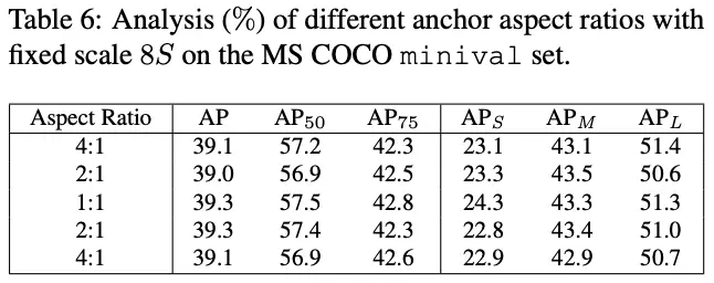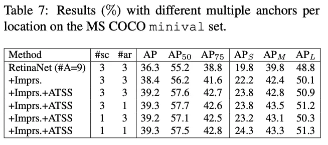 前面的RetinaNet实验只用了一个anchor box,论文补充测试了不同anchor数下的性能,实验中的Imprs为表1中的提升手段。从结果来看,在每个位置设定多个anchor box是无用的操作,关键在于选择合适的正样本